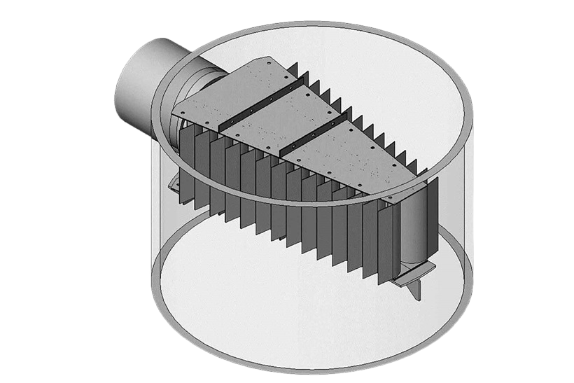 Принцип работы основан на управляемом расширении и перераспределении потока: при прохождении через полуоткрытую трубу скорость смеси снижается, а площадь контакта фаз увеличивается. Это способствует быстрому выделению газовых пузырьков и гравитационному осаждению жидкой фазы — более тяжёлая фракция естественным образом опускается в нижнюю часть сепаратора, а газ поднимается вверх. Особая форма среза трубы обеспечивает равномерное рассеивание потока по сечению аппарата, исключая образование застойных зон и локальных перегрузок, что критически важно для стабильной работы всего сепарационного оборудования.